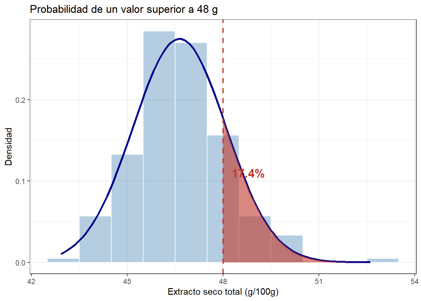 El segundo caso es especialmente importante: ¿qué probabilidad hay de que una muestra tenga un extracto seco superior a un valor umbral? Esta pregunta equivale a calcular el área bajo la curva a partir de ese umbral — la cola derecha de la distribución.