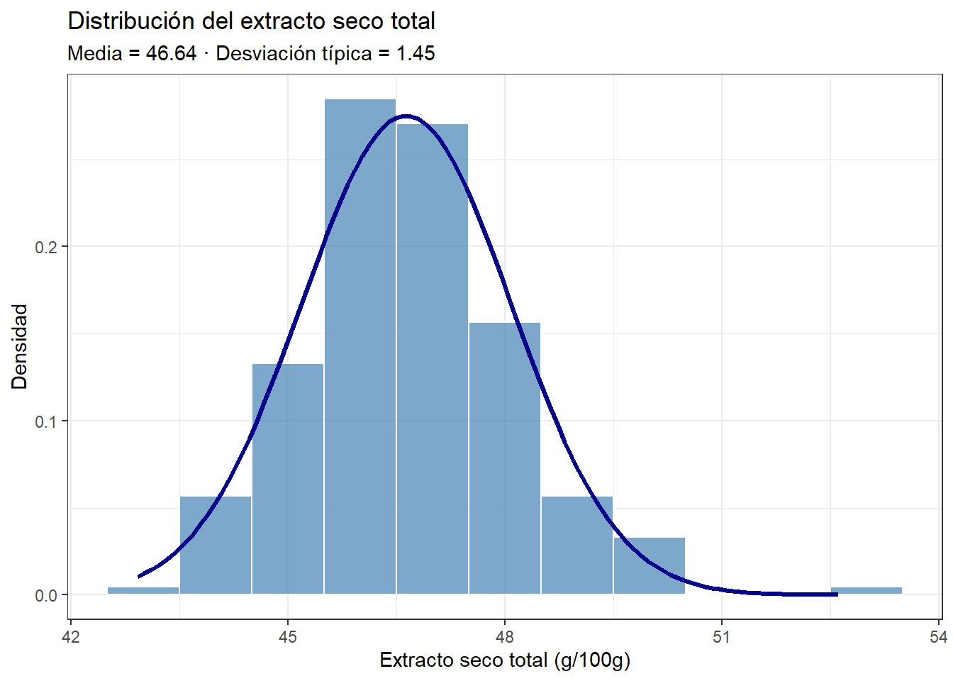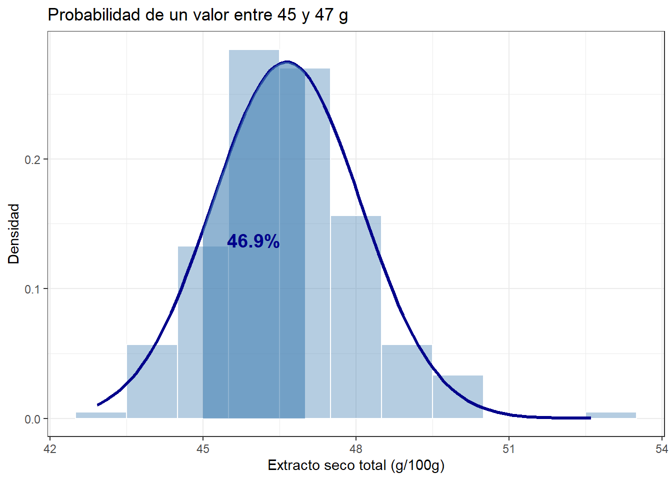 La curva normal nos permite generalizar: una vez ajustada a nuestros datos — es decir, usando la media y la desviación típica de la muestra — podemos calcular la probabilidad de cualquier intervalo, incluso para valores que no aparecen en la muestra. Esta generalización es válida siempre que la distribución de los datos se aproxime a la forma de campana de la curva normal, también llamada campana de Gauss. El área bajo la curva entre dos valores es exactamente esa probabilidad. Como el área total bajo la curva es siempre 1, todas las probabilidades están entre 0 y 1. Veamos primero un intervalo concreto: ¿qué proporción de muestras tiene un extracto seco entre 45 y 47 g?