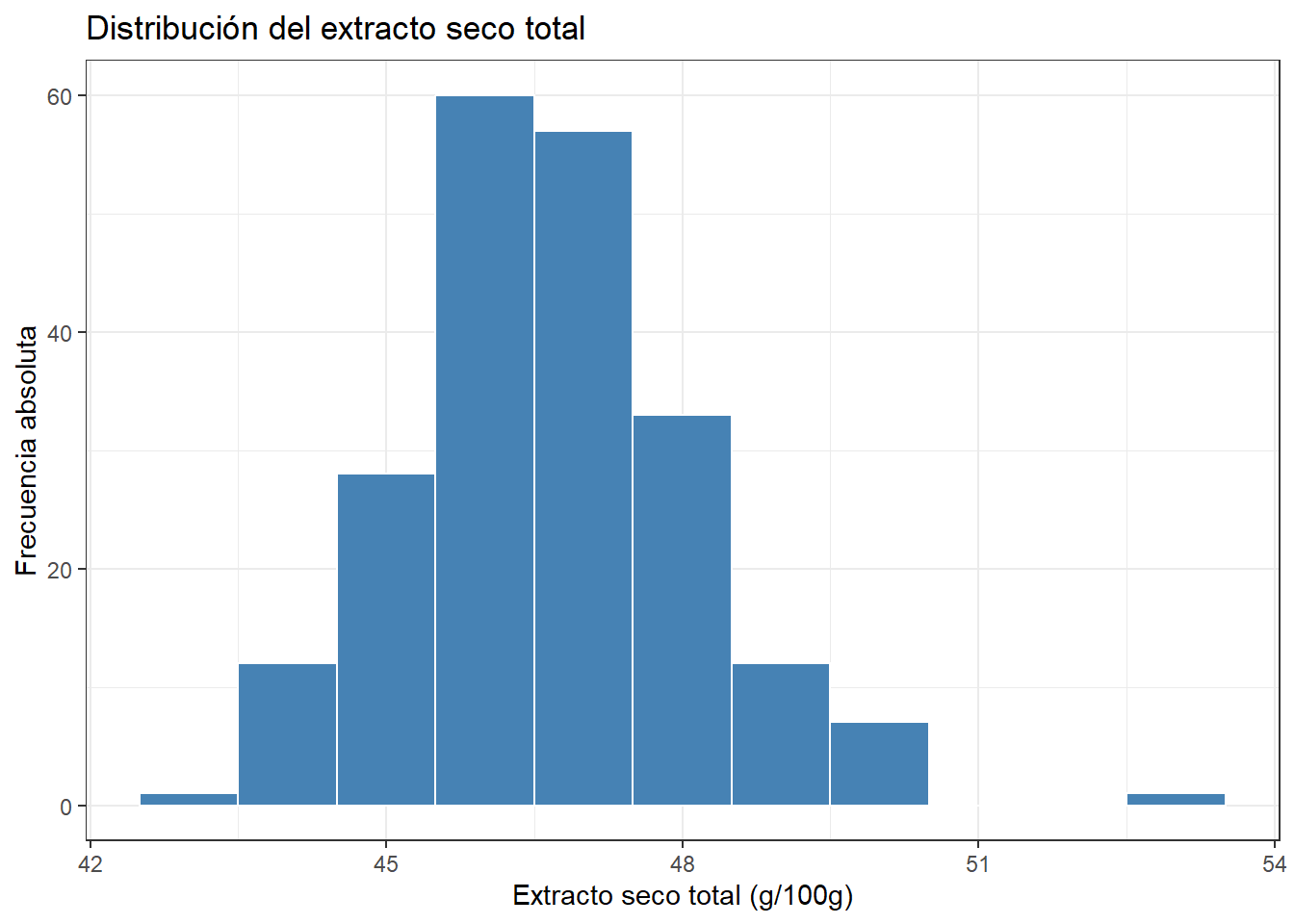 Agrupamos los valores de extracto seco total (est) en intervalos de amplitud 1 y contamos cuántas veces aparece cada intervalo. Ese recuento es la frecuencia absoluta.