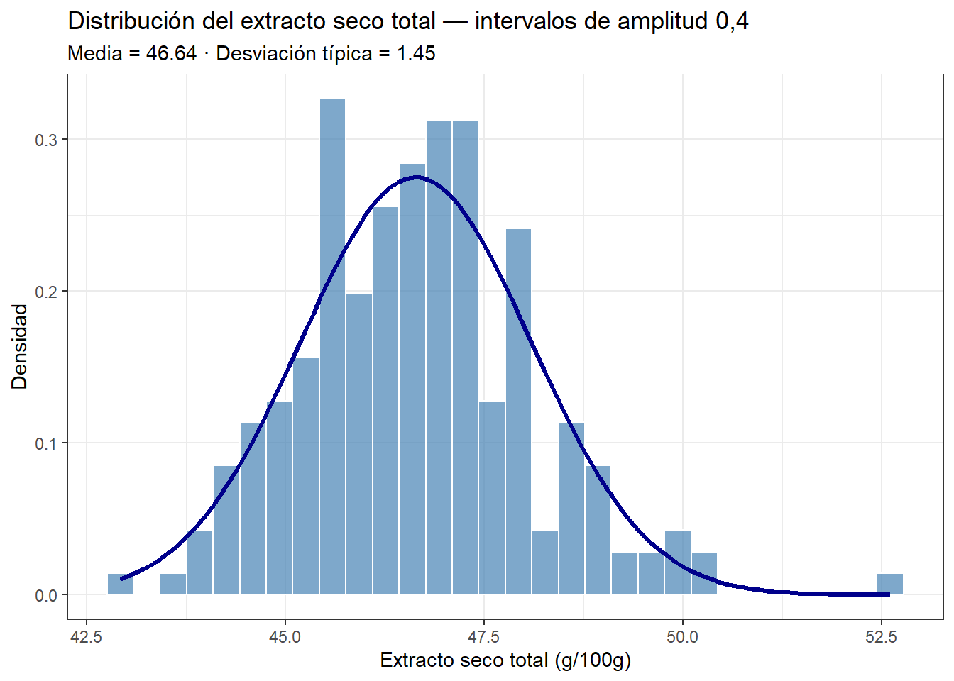 title = "Distribución del extracto seco total — intervalos de amplitud 0,4",