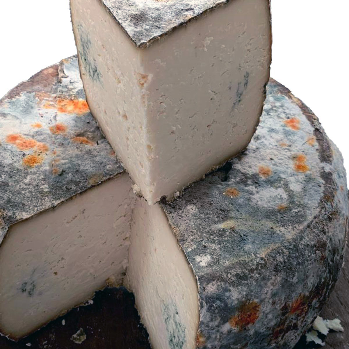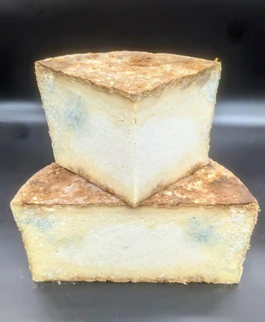 Conviene subrayar, no obstante, que la capa de brea no impide el desarrollo del azul: simplemente lo ralentiza y lo restringe a la zona periférica. El Penicillium presente en las cuevas de maduración penetra por las grietas naturales de la corteza, por los pequeños orificios que crea el propio proceso de contracción-expansión del queso, y a través de las zonas donde el ahumado no fue uniforme. De ahí que el pliego describa «afloraciones cerca de los bordes»: es exactamente donde la corteza es más permeable.