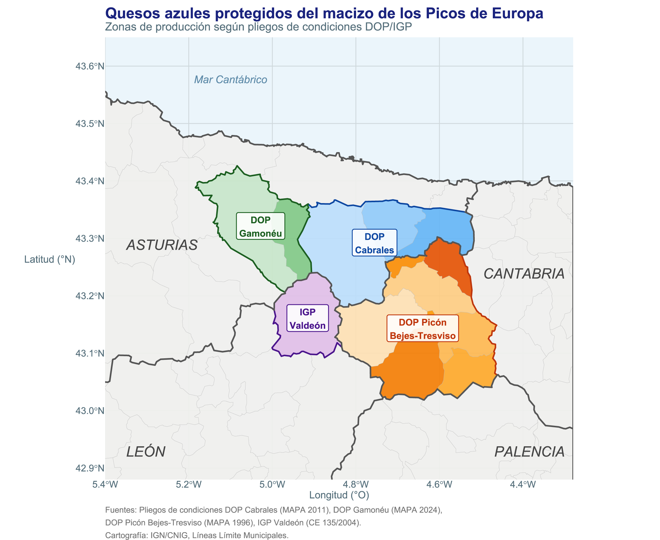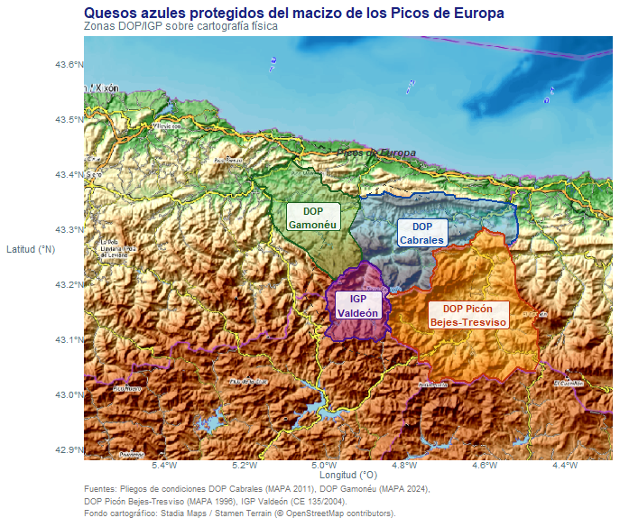 Este macizo no respeta fronteras administrativas. Las zonas de producción de los cuatro quesos azules protegidos del arco cantábrico —DOP Cabrales, DOP Gamonéu, DOP Picón Bejes-Tresviso y IGP Valdeón— se distribuyen sobre el mismo sustrato geológico, siguiendo los límites del afloramiento calizo: