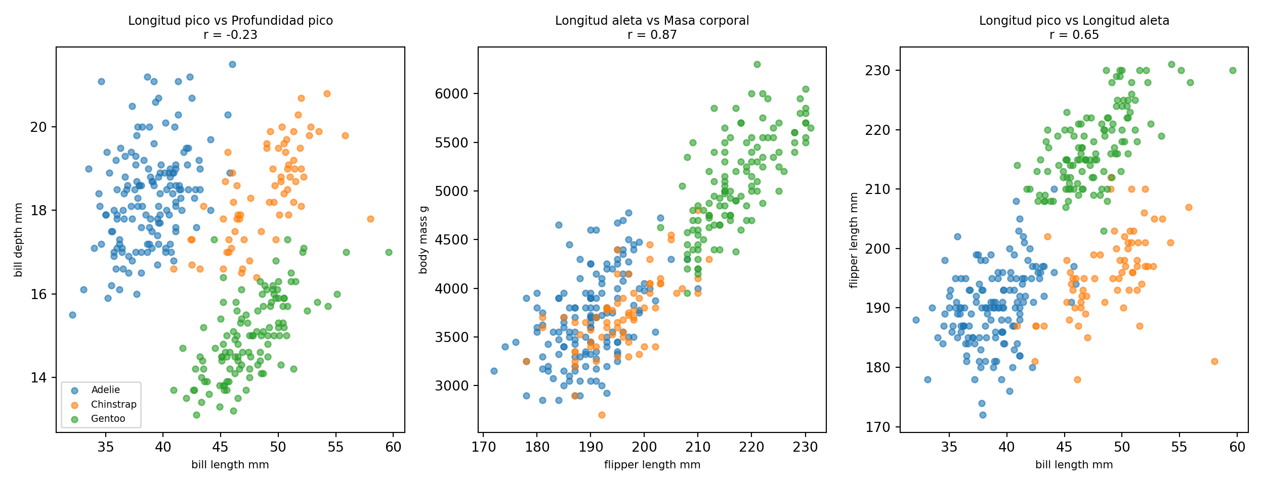 from palmerpenguins import load_penguinspenguins = load_penguins().dropna()fig, axes = plt.subplots(1, 3, figsize=(13, 5))pares = [ ('bill_length_mm', 'bill_depth_mm', 'Longitud pico vs Profundidad pico'), ('flipper_length_mm', 'body_mass_g', 'Longitud aleta vs Masa corporal'), ('bill_length_mm', 'flipper_length_mm', 'Longitud pico vs Longitud aleta'),]colores_sp = {'Adelie': '#1f77b4', 'Chinstrap': '#ff7f0e', 'Gentoo': '#2ca02c'}for ax, (x, y, titulo) inzip(axes, pares):for sp, grp in penguins.groupby('species'): ax.scatter(grp[x], grp[y], alpha=0.6, s=20, color=colores_sp[sp], label=sp) r_val = penguins[[x, y]].corr().iloc[0, 1] ax.set_title(f"{titulo}\nr = {r_val:.2f}", fontsize=9) ax.set_xlabel(x.replace('_', ' '), fontsize=8) ax.set_ylabel(y.replace('_', ' '), fontsize=8)axes[0].legend(fontsize=7)plt.tight_layout()plt.show()
