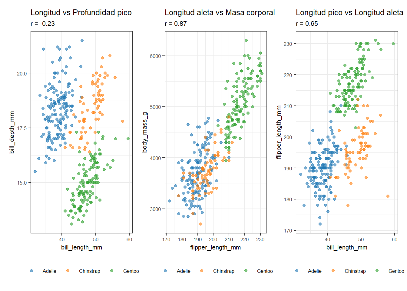 library(palmerpenguins)library(patchwork)pengs <- penguins |>drop_na()hacer_scatter <-function(x, y, titulo) { r_val <-cor(pengs[[x]], pengs[[y]])ggplot(pengs, aes(x = .data[[x]], y = .data[[y]],color = species)) +geom_point(alpha =0.6, size =1.5) +scale_color_manual(values =c("Adelie"="#1f77b4","Chinstrap"="#ff7f0e","Gentoo"="#2ca02c")) +labs(title = titulo,subtitle =paste0("r = ", round(r_val, 2)),x = x, y = y, color =NULL) +theme_bw() +theme(legend.position ="bottom",text =element_text(size =8))}p1 <-hacer_scatter("bill_length_mm", "bill_depth_mm","Longitud vs Profundidad pico")p2 <-hacer_scatter("flipper_length_mm", "body_mass_g","Longitud aleta vs Masa corporal")p3 <-hacer_scatter("bill_length_mm", "flipper_length_mm","Longitud pico vs Longitud aleta")p1 + p2 + p3