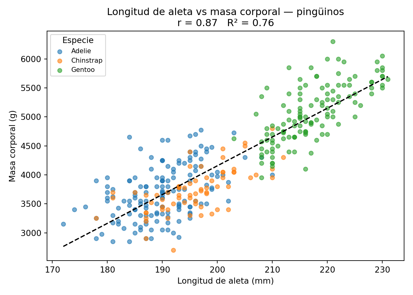 Veamos un ejemplo concreto con los pingüinos. La longitud de la aleta y la masa corporal deberían estar relacionadas: los pingüinos más grandes tienen aletas más largas. Calculamos \(r\) y visualizamos la relación con la línea de regresión:
