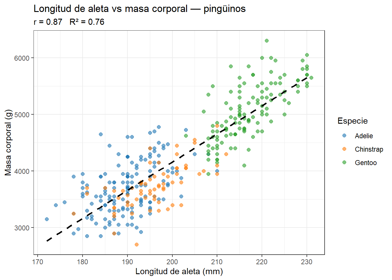 El gráfico muestra una relación positiva clara: los pingüinos con aletas más largas son más pesados. Ahora que tenemos el gráfico delante, podemos entender mejor qué significan \(r\) y \(R^2\):