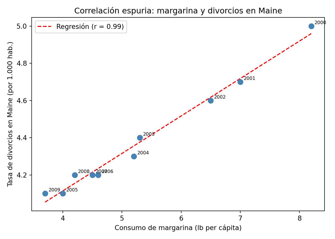 Correlación espuria entre consumo de margarina y tasa de divorcios en Maine (E.E.U.U.)