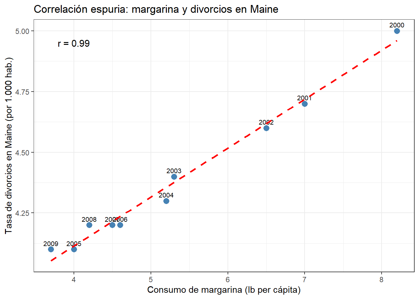 El primero tiene una conexión temática directa con este libro: el consumo de margarina per cápita correlaciona muy fuertemente con el número de divorcios en el estado de Maine (Estados Unidos). Ambas variables han crecido en paralelo durante décadas, pero nadie diría que comer más margarina lleva a divorciarse más.