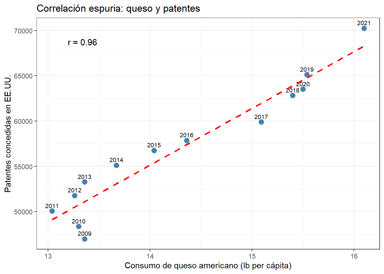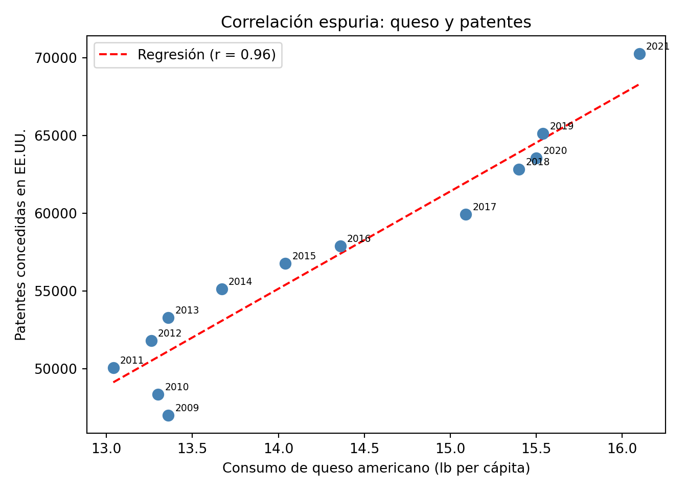 El segundo es el consumo de queso en E.E.U.U., que correlaciona con el número de patentes concedidas en el país. La causa es simplemente que ambas series tienen tendencias temporales similares en el período analizado.