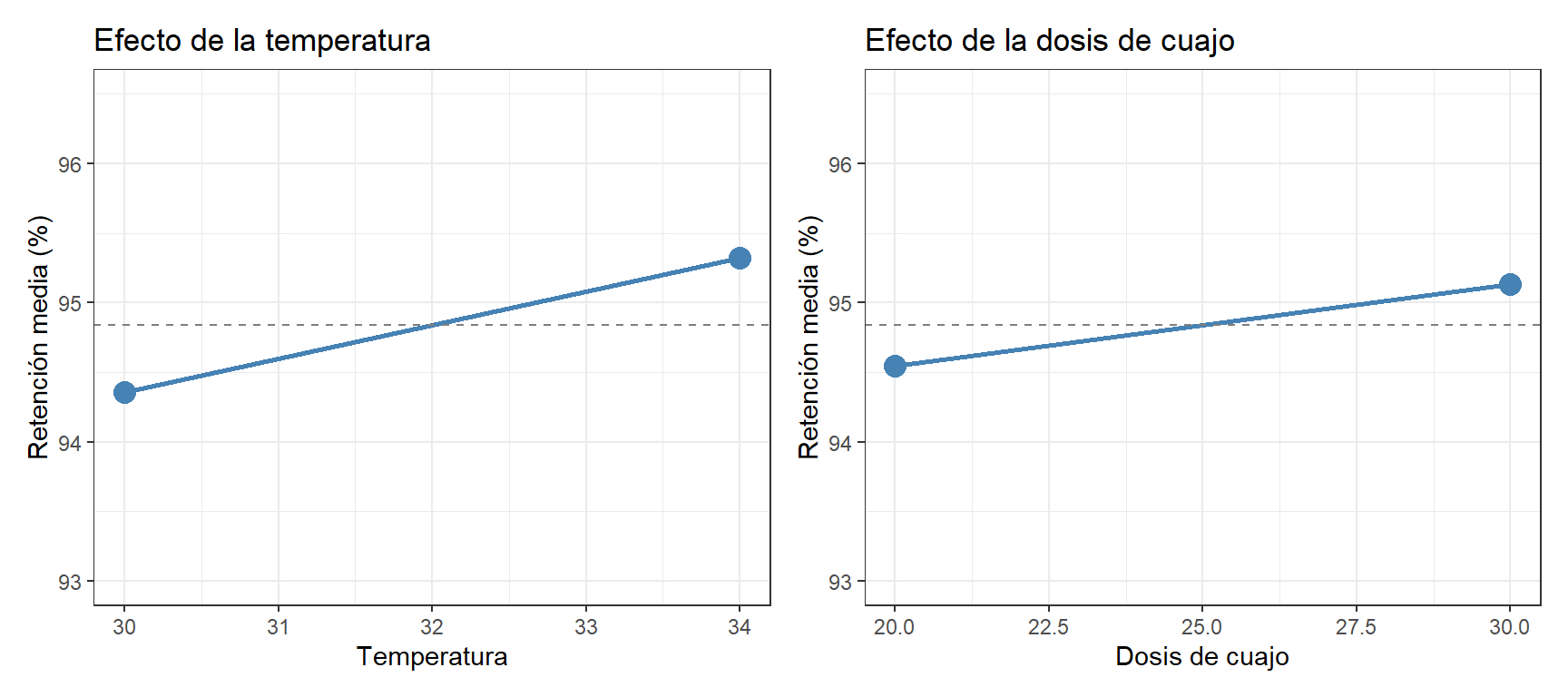 La línea discontinua horizontal es la media global del experimento. Los dos gráficos muestran que tanto la temperatura como la dosis de cuajo tienen un efecto positivo sobre la retención: subir la temperatura de 30°C a 34°C mejora la retención en promedio, y subir la dosis de 20 a 30 ml/100L también.
