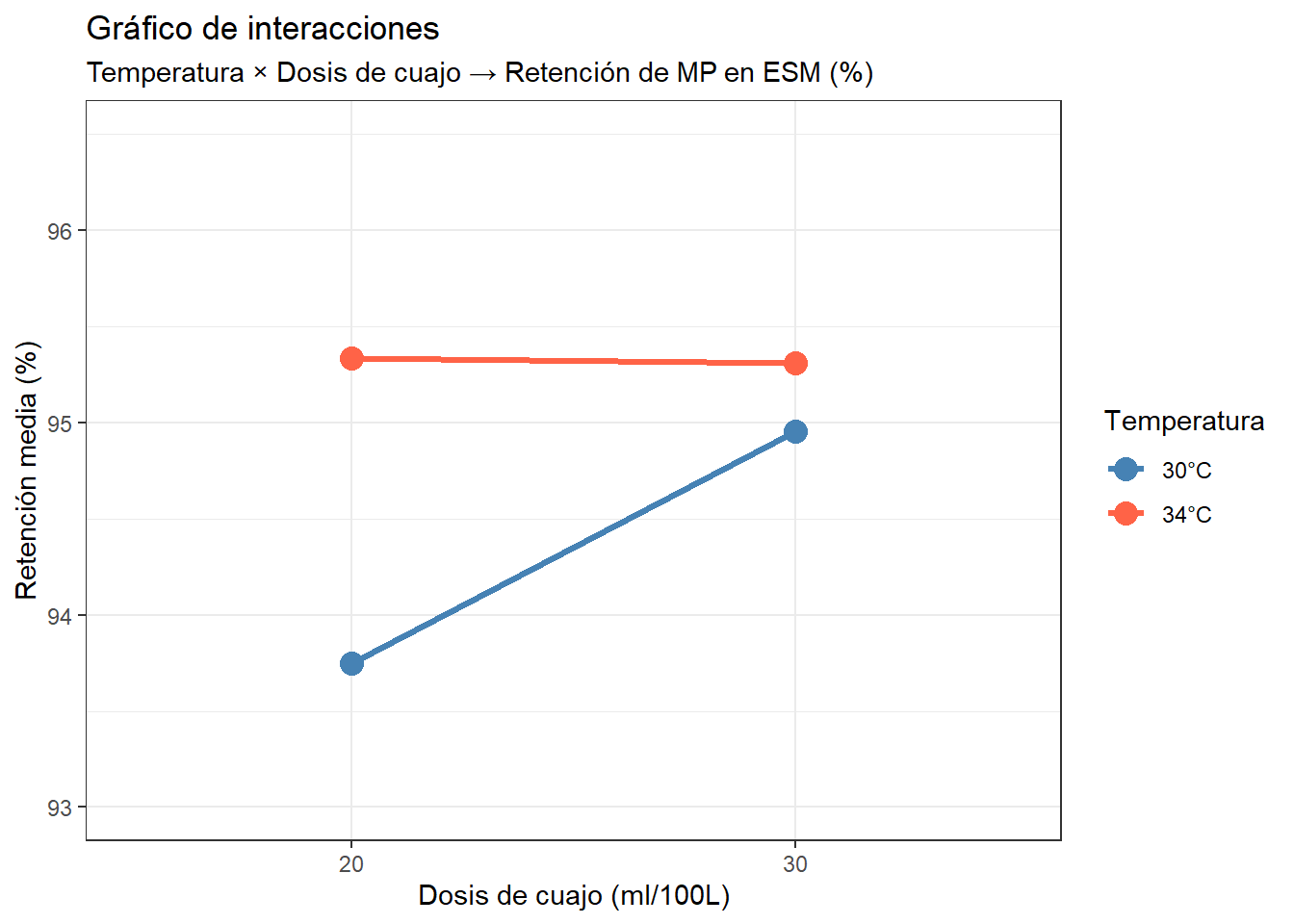 La tabla de medias ya revela algo importante: a 30°C, subir la dosis de cuajo de 20 a 30 ml/100L mejora la retención en más de 1 punto (de 93,75% a 94,96%). Pero a 34°C, esa misma subida de dosis apenas produce mejora (de 95,34% a 95,31%). Esto es exactamente una interacción, y es precisamente la información que el enfoque OFAT nunca habría podido revelar.