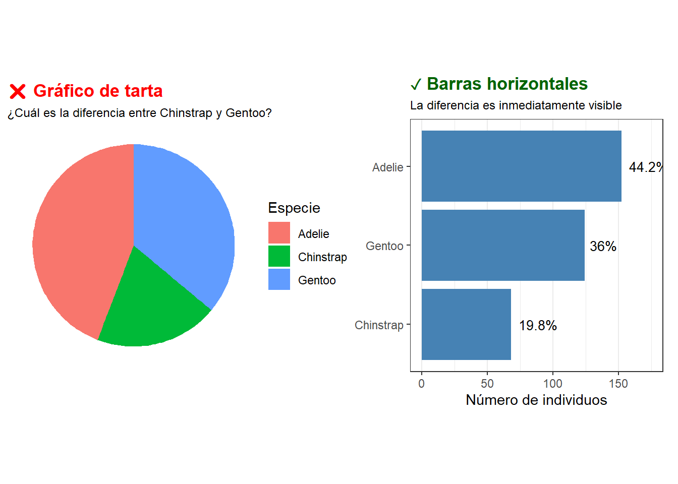 library(tidyverse)library(palmerpenguins)library(patchwork)conteo <- penguins |>count(species) |>mutate(pct = n /sum(n) *100)# Gráfico incorrecto: tartap_malo <-ggplot(conteo, aes(x ="", y = pct, fill = species)) +geom_col(width =1) +coord_polar("y") +labs(title ="❌ Gráfico de tarta",subtitle ="¿Cuál es la diferencia entre Chinstrap y Gentoo?",fill ="Especie", x =NULL, y =NULL) +theme_void() +theme(plot.title =element_text(color ="red", face ="bold"),plot.subtitle =element_text(size =9))# Gráfico correcto: barras horizontales ordenadasp_bueno <- conteo |>mutate(species =fct_reorder(species, n)) |>ggplot(aes(x = n, y = species)) +geom_col(fill ="steelblue") +geom_text(aes(label =paste0(round(pct, 1), "%")),hjust =-0.2, size =3.5) +xlim(0, 175) +labs(title ="✓ Barras horizontales",subtitle ="La diferencia es inmediatamente visible",x ="Número de individuos", y =NULL) +theme_bw() +theme(panel.grid.major.y =element_blank(),plot.title =element_text(color ="darkgreen", face ="bold"),plot.subtitle =element_text(size =9))p_malo + p_bueno