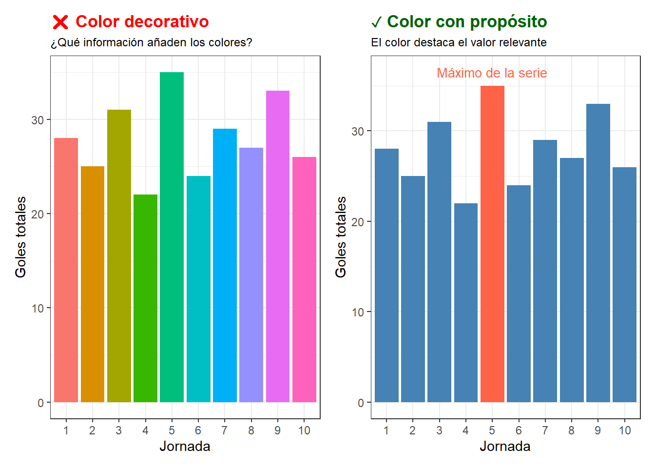# Datos de ejemplo: goles por jornada (primeras 10 jornadas de La Liga)set.seed(42)jornadas <-tibble(jornada =1:10,goles =c(28, 25, 31, 22, 35, 24, 29, 27, 33, 26))# Gráfico incorrecto: un color por barra sin motivop_malo2 <-ggplot(jornadas, aes(x =factor(jornada), y = goles,fill =factor(jornada))) +geom_col() +labs(title ="❌ Color decorativo",subtitle ="¿Qué información añaden los colores?",x ="Jornada", y ="Goles totales") +theme_bw() +theme(legend.position ="none",plot.title =element_text(color ="red", face ="bold"),plot.subtitle =element_text(size =9))# Gráfico correcto: un color, destacando el máximop_bueno2 <- jornadas |>mutate(destacar = goles ==max(goles)) |>ggplot(aes(x =factor(jornada), y = goles, fill = destacar)) +geom_col() +scale_fill_manual(values =c("FALSE"="steelblue", "TRUE"="tomato")) +annotate("text", x =5, y =36.5, label ="Máximo de la serie",color ="tomato", size =3.5) +labs(title ="✓ Color con propósito",subtitle ="El color destaca el valor relevante",x ="Jornada", y ="Goles totales") +theme_bw() +theme(legend.position ="none",plot.title =element_text(color ="darkgreen", face ="bold"),plot.subtitle =element_text(size =9))p_malo2 + p_bueno2