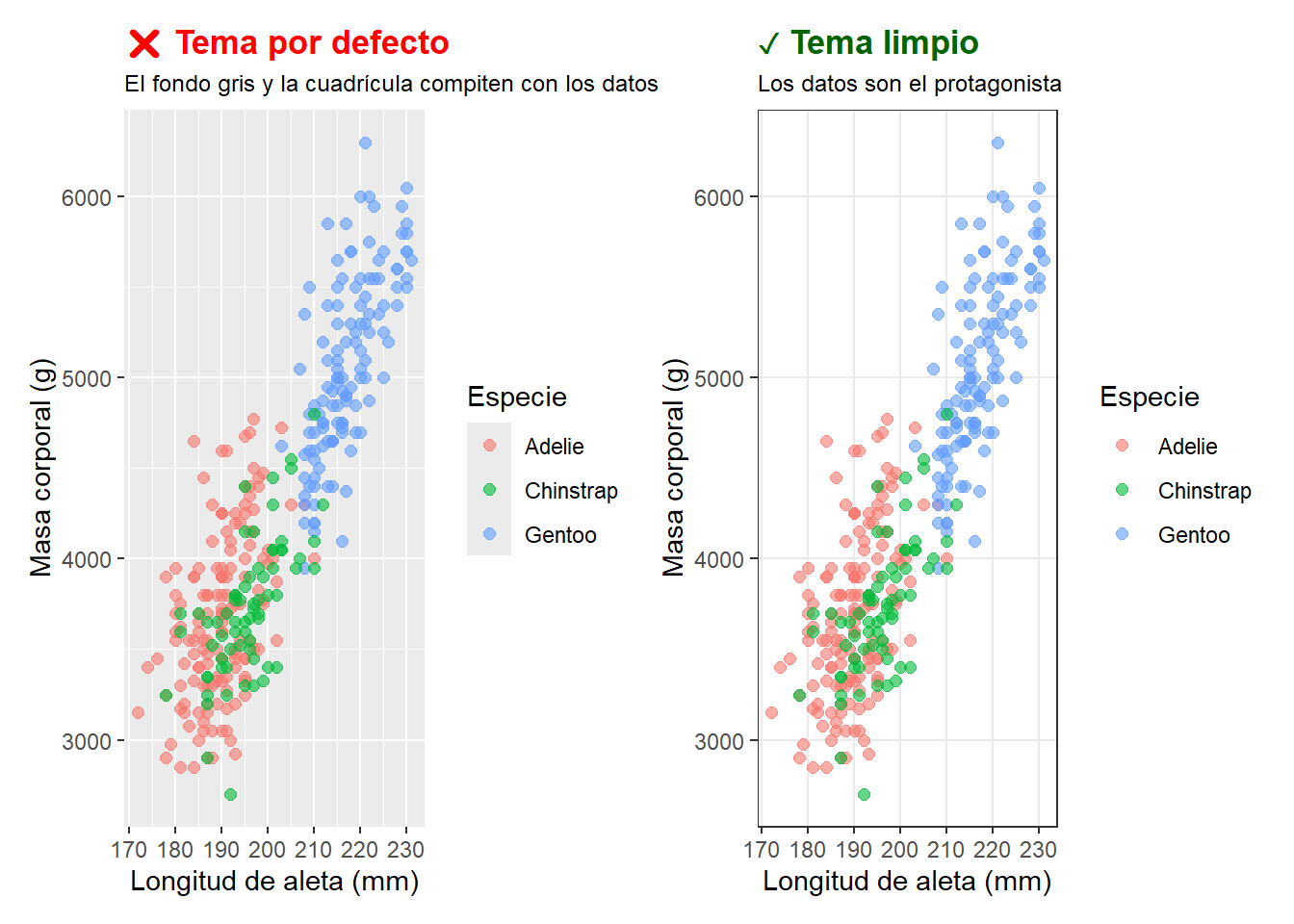 datos_temp <- penguins |>filter(!is.na(flipper_length_mm), !is.na(body_mass_g))# Gráfico incorrecto: tema por defecto con fondo grisp_malo3 <-ggplot(datos_temp, aes(x = flipper_length_mm, y = body_mass_g,color = species)) +geom_point(alpha =0.6, size =2) +labs(title ="❌ Tema por defecto",subtitle ="El fondo gris y la cuadrícula compiten con los datos",x ="Longitud de aleta (mm)", y ="Masa corporal (g)",color ="Especie") +theme(plot.title =element_text(color ="red", face ="bold"),plot.subtitle =element_text(size =9))# Gráfico correcto: tema limpio sin cuadrícula secundariap_bueno3 <-ggplot(datos_temp, aes(x = flipper_length_mm, y = body_mass_g,color = species)) +geom_point(alpha =0.6, size =2) +labs(title ="✓ Tema limpio",subtitle ="Los datos son el protagonista",x ="Longitud de aleta (mm)", y ="Masa corporal (g)",color ="Especie") +theme_bw() +theme(panel.grid.minor =element_blank(),plot.title =element_text(color ="darkgreen", face ="bold"),plot.subtitle =element_text(size =9))p_malo3 + p_bueno3