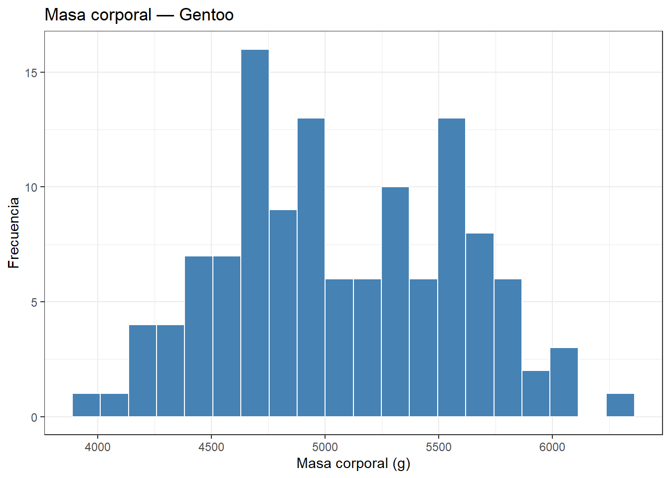 library(palmerpenguins)# Versión de exploración: rápida, sin pulirpenguins |>filter(species =="Gentoo") |>ggplot(aes(x = body_mass_g)) +geom_histogram(bins =20, fill ="steelblue", color ="white") +theme_bw() +labs(title ="Masa corporal — Gentoo",x ="Masa corporal (g)", y ="Frecuencia")