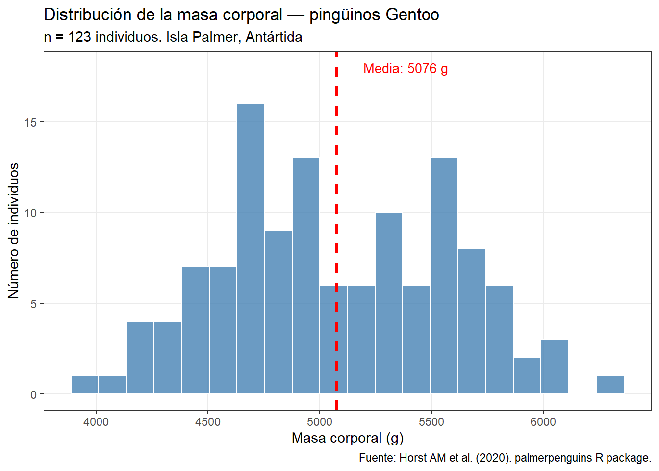 gentoo <- penguins |>filter(species =="Gentoo", !is.na(body_mass_g))media_g <-mean(gentoo$body_mass_g)# Versión de comunicación: orientada al mensajegentoo |>ggplot(aes(x = body_mass_g)) +geom_histogram(bins =20, fill ="steelblue", color ="white", alpha =0.8) +geom_vline(xintercept = media_g, color ="red",linewidth =1, linetype ="dashed") +annotate("text", x = media_g +120, y =18,label =paste0("Media: ", round(media_g), " g"),color ="red", size =3.5, hjust =0) +theme_bw() +theme(panel.grid.minor =element_blank()) +labs(title ="Distribución de la masa corporal — pingüinos Gentoo",subtitle =paste0("n = ", nrow(gentoo), " individuos. Isla Palmer, Antártida"),x ="Masa corporal (g)",y ="Número de individuos",caption ="Fuente: Horst AM et al. (2020). palmerpenguins R package.")