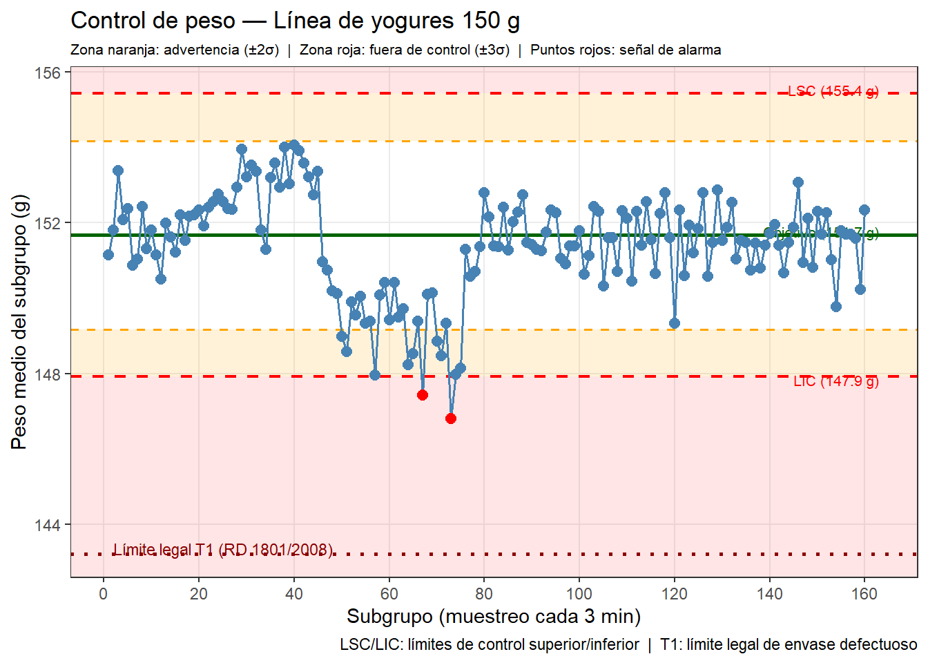library(tidyverse)# Cargamos el dataset de muestreo de yogures (Fase I: proceso estable)df_m <-read_csv2("datos/llenado_yogures_muestra.csv",locale =locale(decimal_mark =","))# Calculamos medias y límites de control sobre Fase I (primeros 17 subgrupos)fase1 <- df_m |>filter(muestra <=17)media_ref <-mean(fase1$peso_g)sigma_ref <-sd(fase1$peso_g)UCL <- media_ref +3* sigma_refLCL <- media_ref -3* sigma_refUWL <- media_ref +2* sigma_ref # límite de advertencia superiorLWL <- media_ref -2* sigma_ref # límite de advertencia inferiorT1 <-143.2# límite legal RD 1801/2008# Medias por subgrupomedias_sg <- df_m |>group_by(muestra) |>summarise(media =mean(peso_g), .groups ="drop") |>mutate(fuera_control = media > UCL | media < LCL)ggplot(medias_sg, aes(x = muestra, y = media)) +# Zona de advertencia (entre 2σ y 3σ)annotate("rect", xmin =-Inf, xmax =Inf,ymin = LCL, ymax = LWL,fill ="orange", alpha =0.15) +annotate("rect", xmin =-Inf, xmax =Inf,ymin = UWL, ymax = UCL,fill ="orange", alpha =0.15) +# Zona fuera de controlannotate("rect", xmin =-Inf, xmax =Inf,ymin =-Inf, ymax = LCL,fill ="red", alpha =0.1) +annotate("rect", xmin =-Inf, xmax =Inf,ymin = UCL, ymax =Inf,fill ="red", alpha =0.1) +# Límite legal T1geom_hline(yintercept = T1, color ="darkred",linetype ="dotted", linewidth =1) +annotate("text", x =2, y = T1 +0.15,label ="Límite legal T1 (RD 1801/2008)",color ="darkred", size =3, hjust =0) +# Líneas de controlgeom_hline(yintercept = UCL, color ="red",linetype ="dashed", linewidth =0.8) +geom_hline(yintercept = LCL, color ="red",linetype ="dashed", linewidth =0.8) +geom_hline(yintercept = UWL, color ="orange",linetype ="dashed", linewidth =0.6) +geom_hline(yintercept = LWL, color ="orange",linetype ="dashed", linewidth =0.6) +geom_hline(yintercept = media_ref, color ="darkgreen",linewidth =1) +# Anotaciones de las líneasannotate("text", x =163, y = UCL +0.1,label =paste0("LSC (", round(UCL, 1), " g)"),color ="red", size =2.8, hjust =1) +annotate("text", x =163, y = LCL -0.1,label =paste0("LIC (", round(LCL, 1), " g)"),color ="red", size =2.8, hjust =1) +annotate("text", x =163, y = media_ref +0.1,label =paste0("Objetivo (", round(media_ref, 1), " g)"),color ="darkgreen", size =2.8, hjust =1) +# Puntosgeom_line(color ="steelblue", linewidth =0.7) +geom_point(aes(color = fuera_control), size =2.5) +scale_color_manual(values =c("FALSE"="steelblue", "TRUE"="red"),guide ="none") +scale_x_continuous(breaks =seq(0, 160, 20)) +labs(title ="Control de peso — Línea de yogures 150 g",subtitle ="Zona naranja: advertencia (±2σ) | Zona roja: fuera de control (±3σ) | Puntos rojos: señal de alarma",x ="Subgrupo (muestreo cada 3 min)",y ="Peso medio del subgrupo (g)",caption ="LSC/LIC: límites de control superior/inferior | T1: límite legal de envase defectuoso" ) +theme_bw() +theme(panel.grid.minor =element_blank(),plot.subtitle =element_text(size =8))